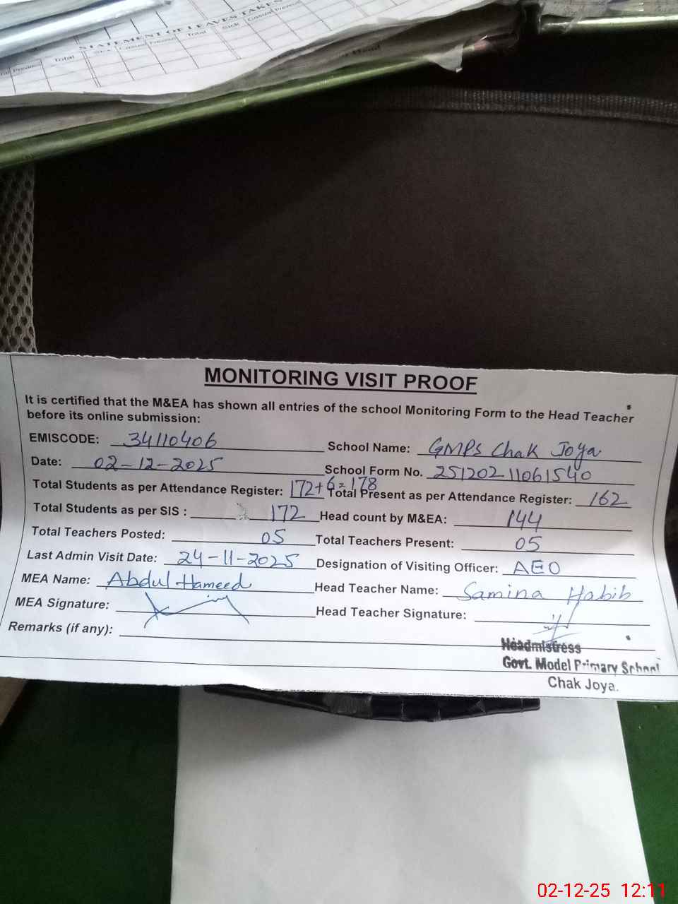 | EMIS Code: 34110406 | Name of School: GMPS CHAK JOYA | |||