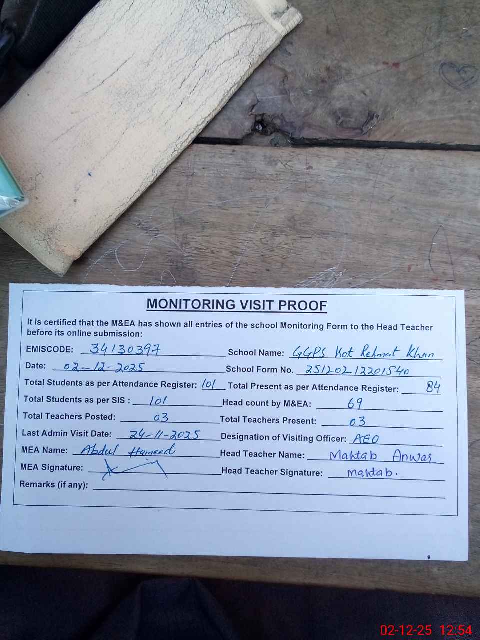 | Attendance Register | Head Teacher | MEA with School | Visit Proof |