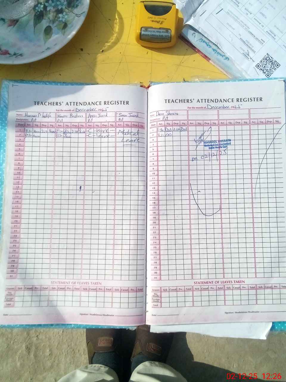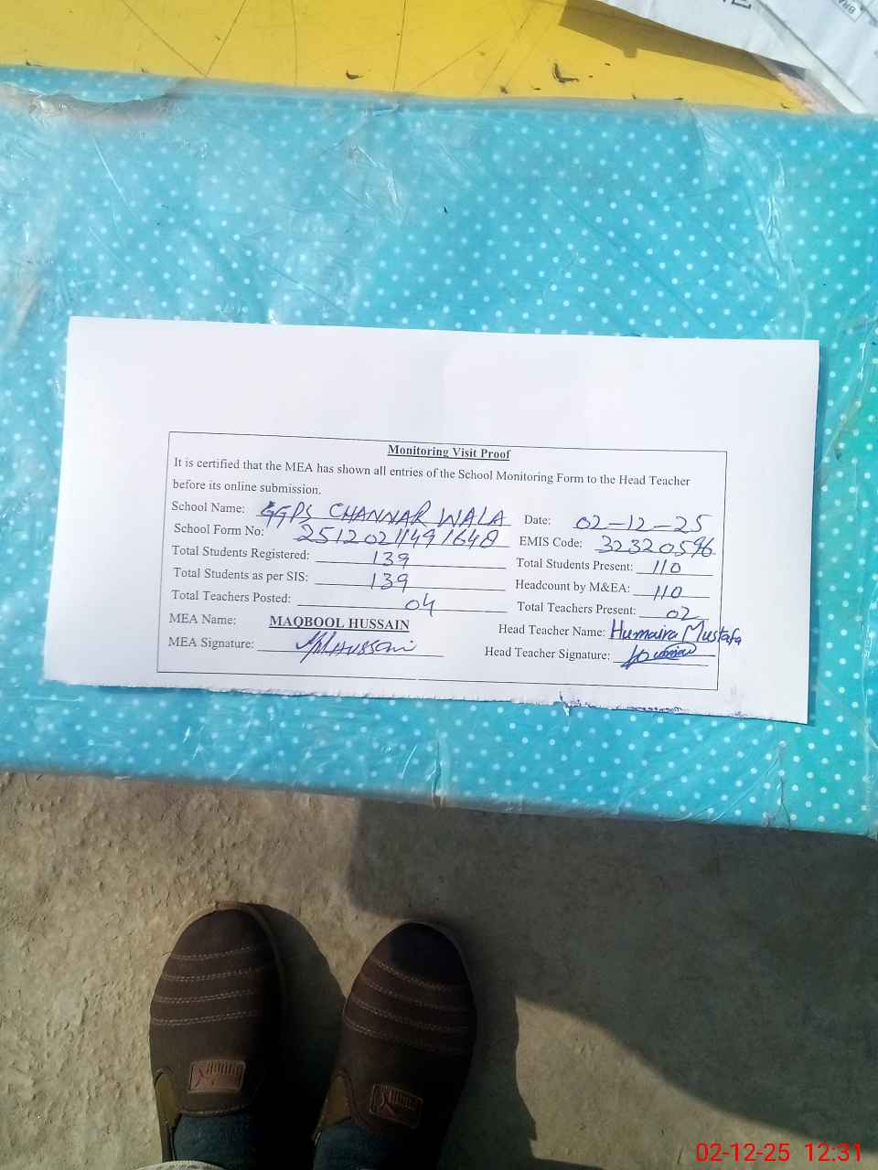| Attendance Register | Head Teacher | MEA with School | Visit Proof |