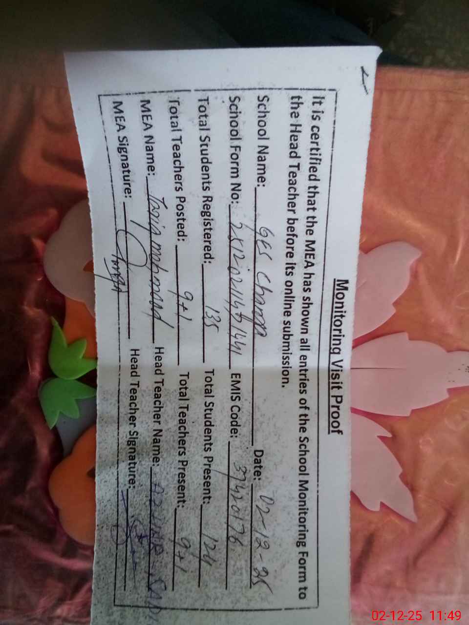 | Attendance Register | Head Teacher | MEA with School | Visit Proof |