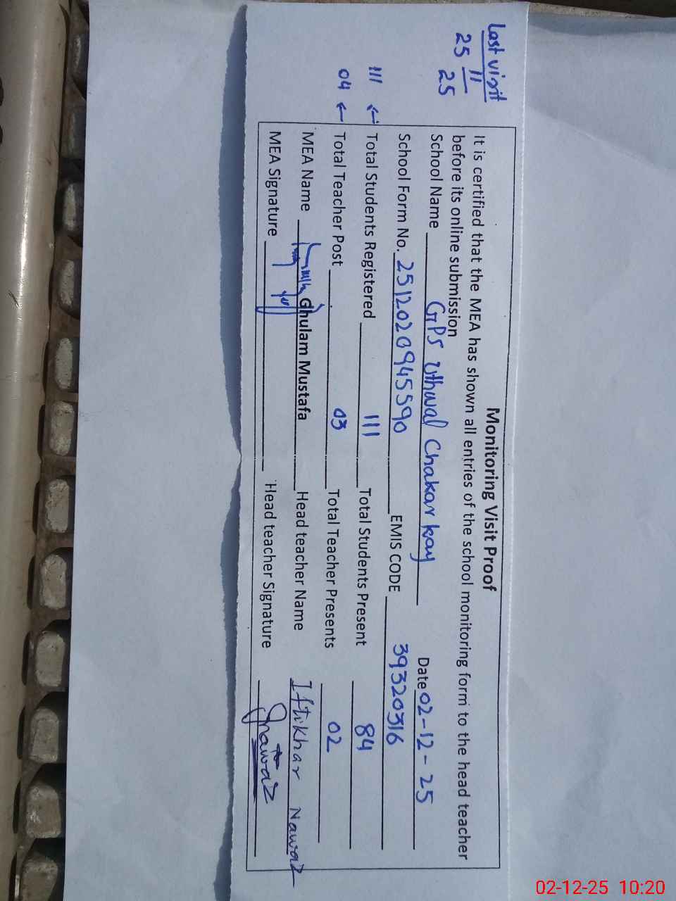 | Attendance Register | Head Teacher | MEA with School | Visit Proof |
