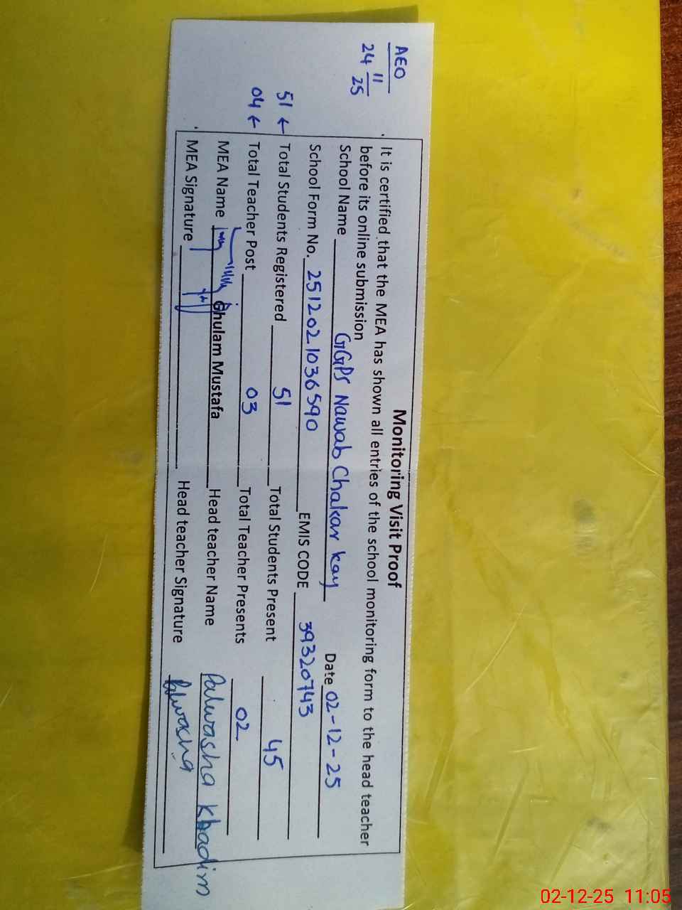| Attendance Register | Head Teacher | MEA with School | Visit Proof |