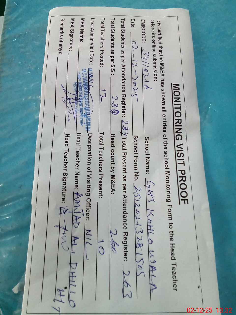 | EMIS Code: 34110216 | Name of School: GHS KOHLO WALA | |||
