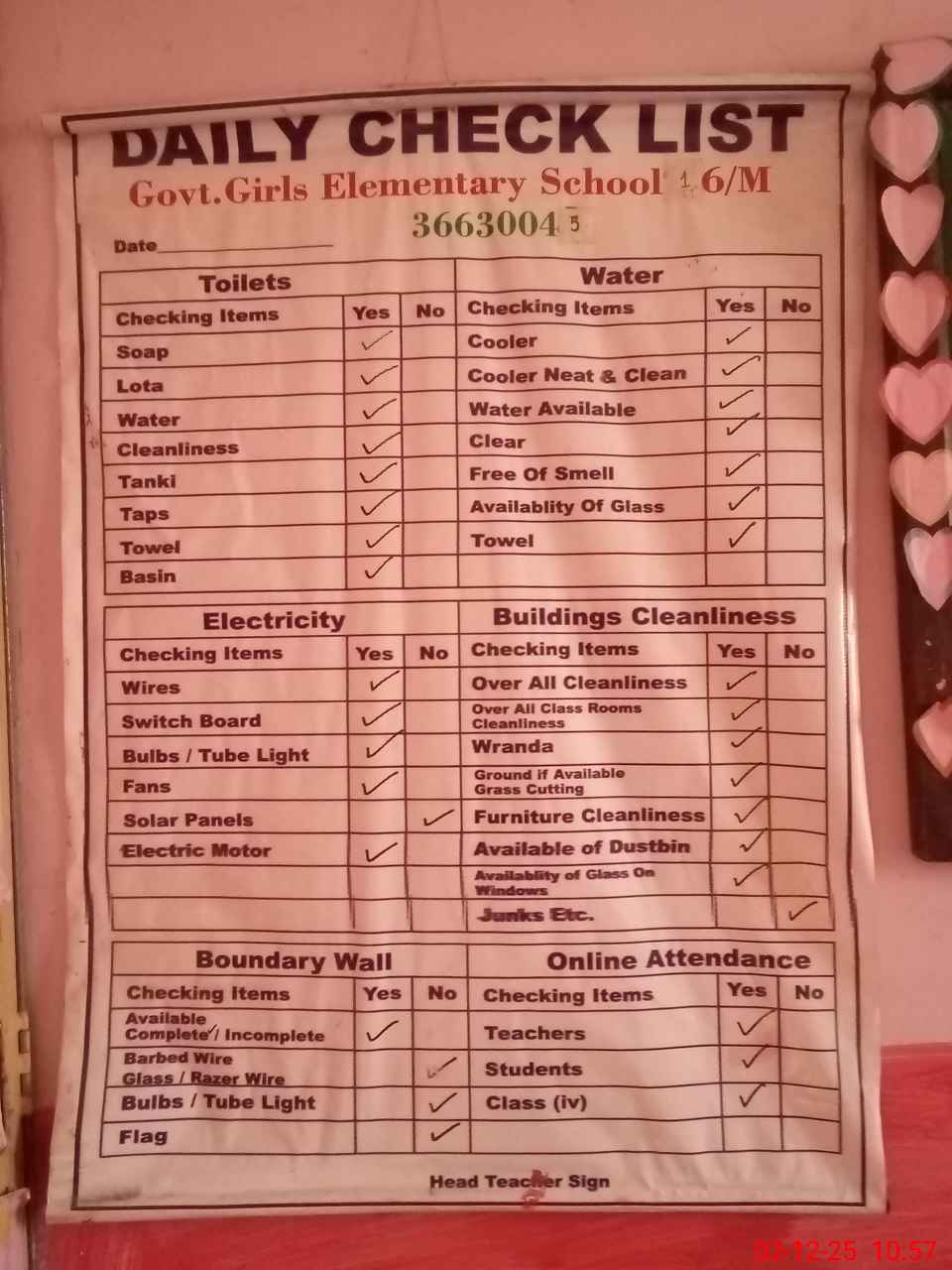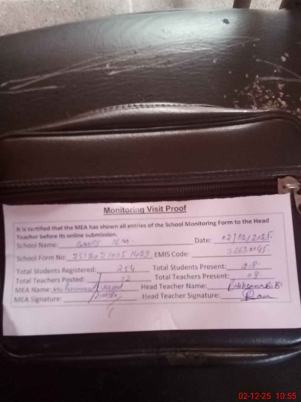 | Attendance Register | Head Teacher | MEA with School | Visit Proof |
