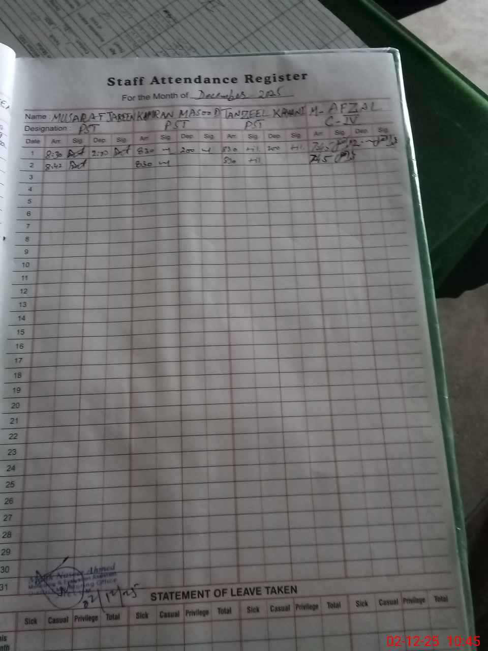 | CNIC | Full Name | Designation | R/C | Absence During Last Calender Month |