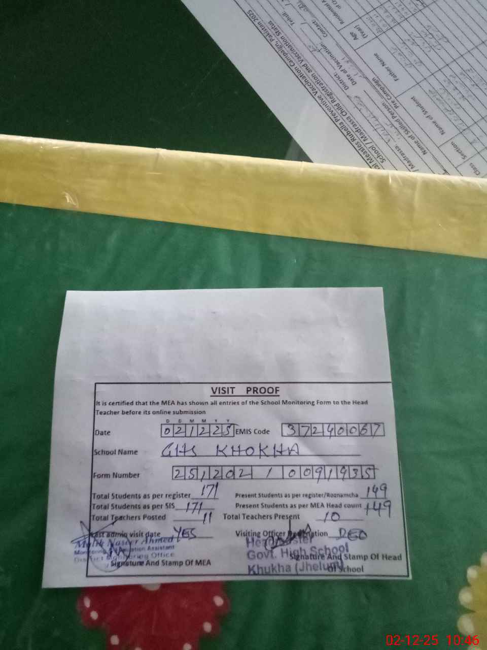 | Certified that this School was Inspected by the Undersigned MEA/DMO Today and the Information Stated Above is as Per Record. | |||||