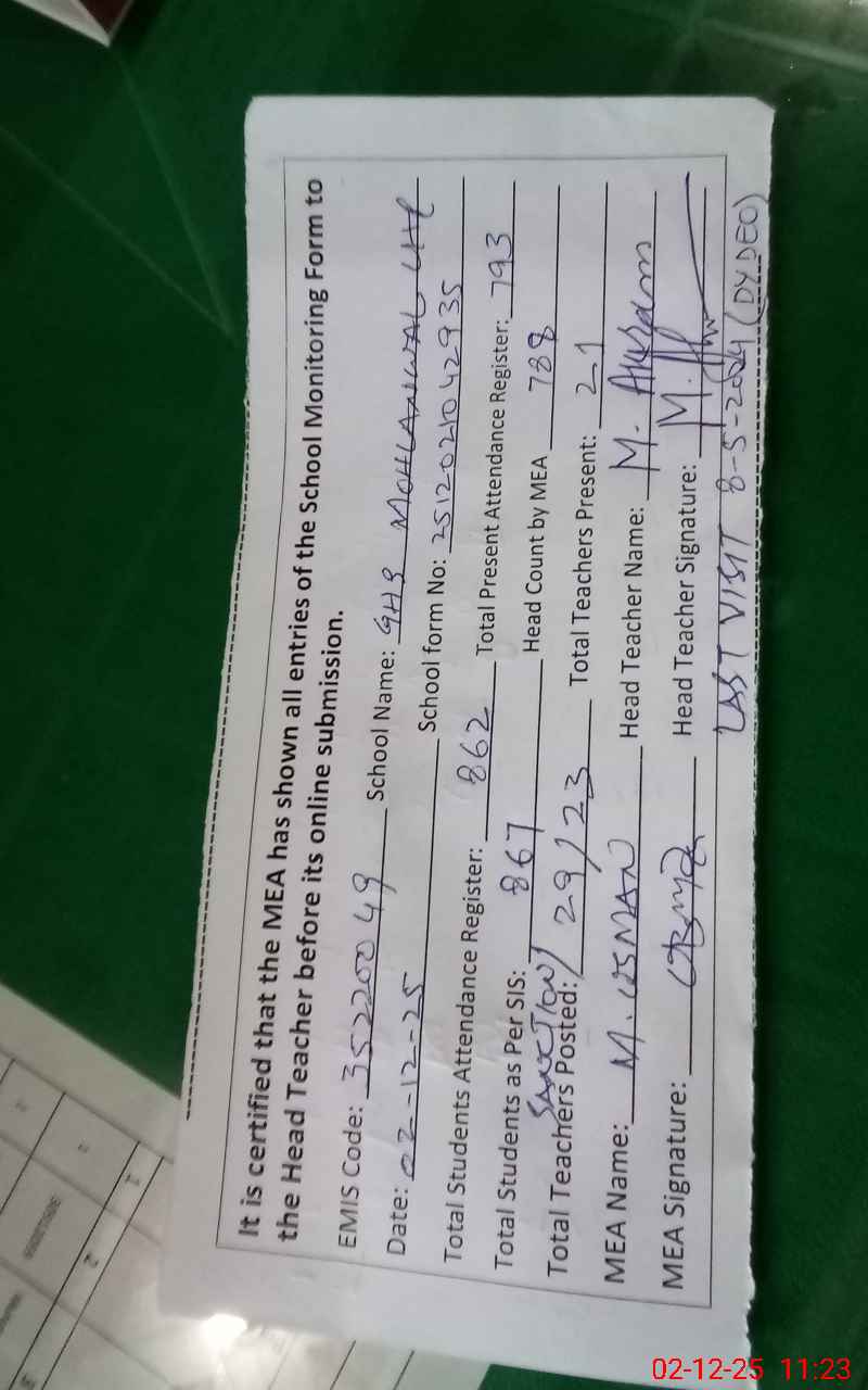 | EMIS Code: 35220049 | Name of School: GHS MOHLANWAL LAHORE | |||