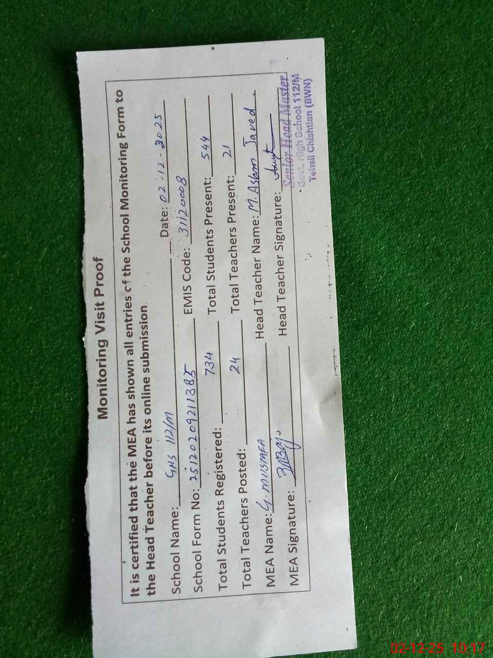 | Attendance Register | Head Teacher | MEA with School | Visit Proof |