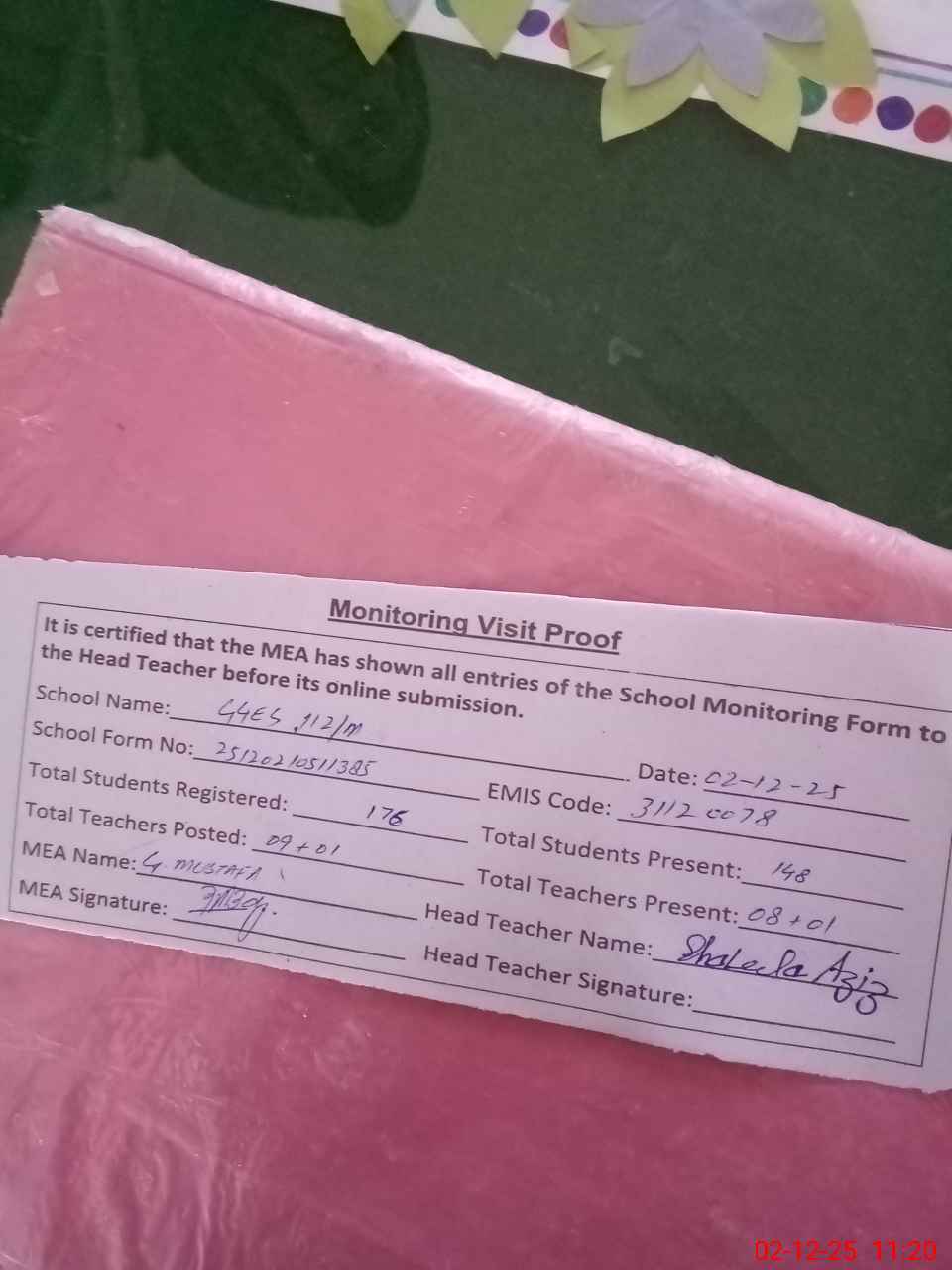 | Attendance Register | Head Teacher | MEA with School | Visit Proof |