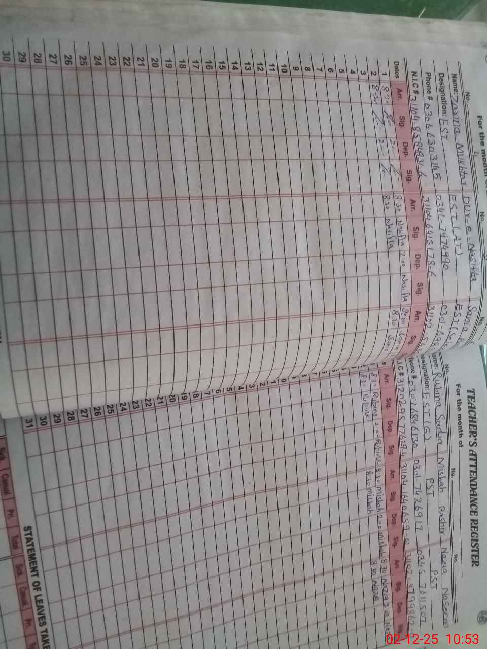 | CNIC | Full Name | Designation | R/C | Absence During Last Calender Month |
