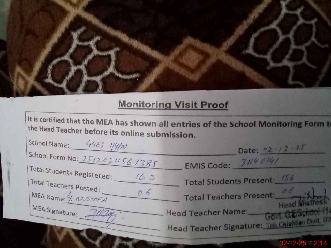 | EMIS Code: 31120141 | Name of School: GGES CHAK NO. 114/M | |||