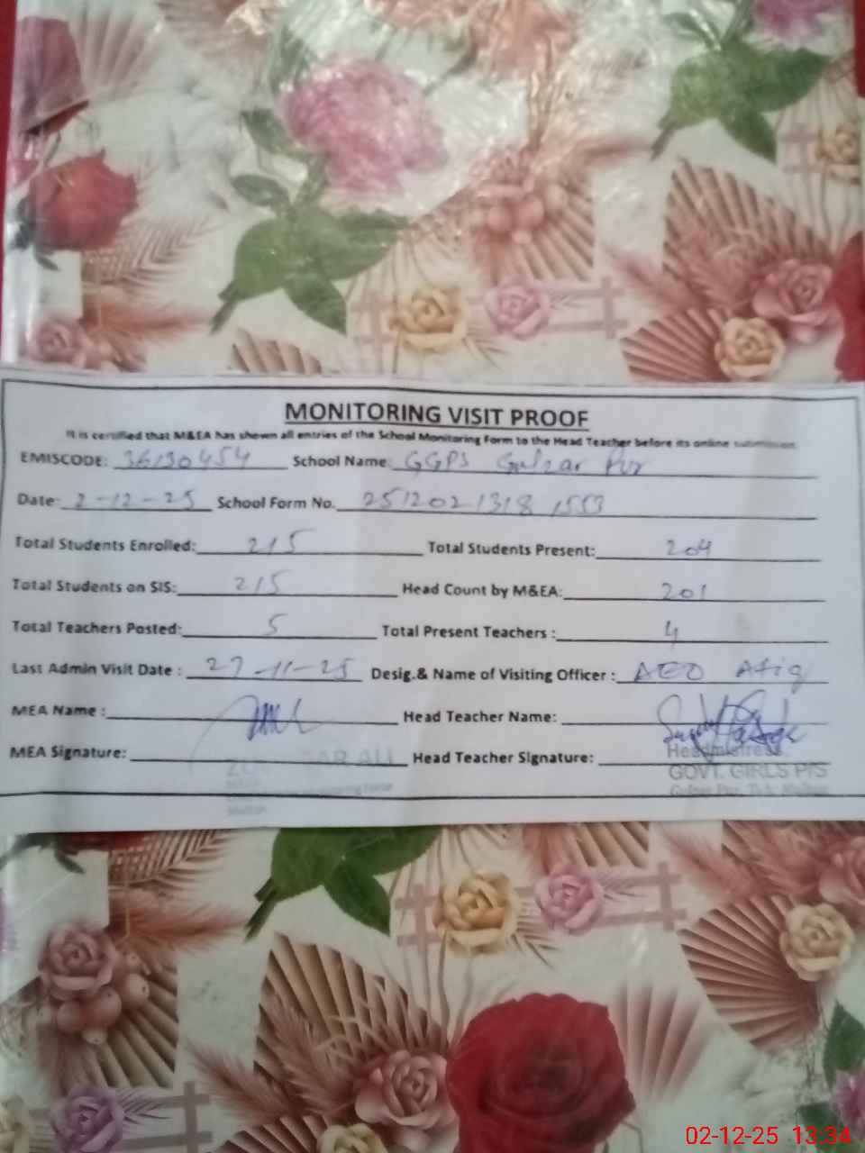 | Attendance Register | Head Teacher | MEA with School | Visit Proof |