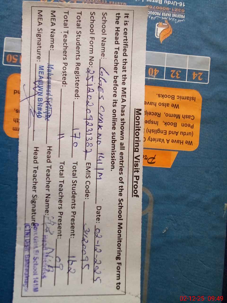| EMIS Code: 31120095 | Name of School: GGES CHAK NO. 141/M | |||