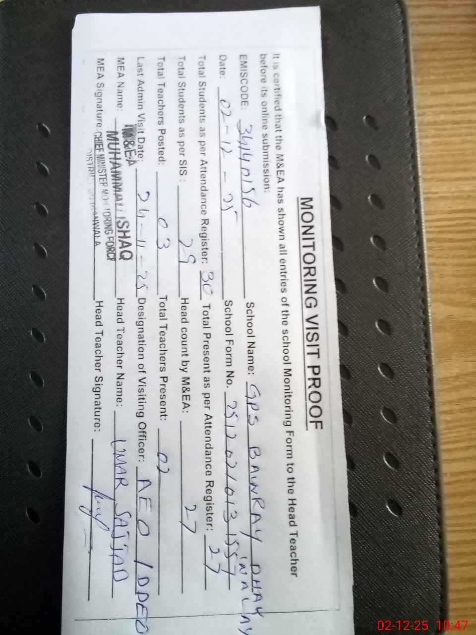 | EMIS Code: 34140156 | Name of School: GPS BAWRAY DHAK WALAY | |||