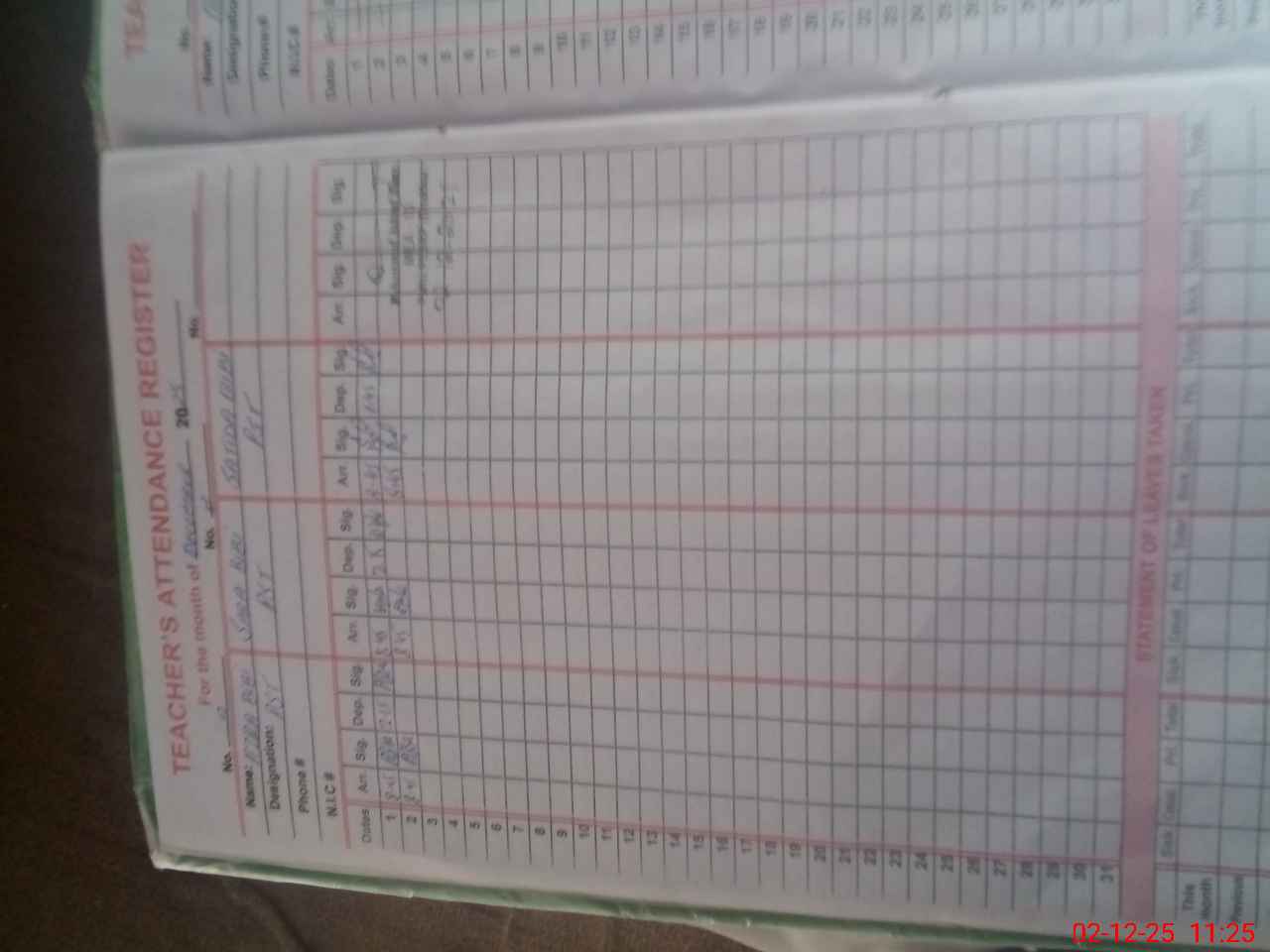 | CNIC | Full Name | Designation | R/C | Absence During Last Calender Month |