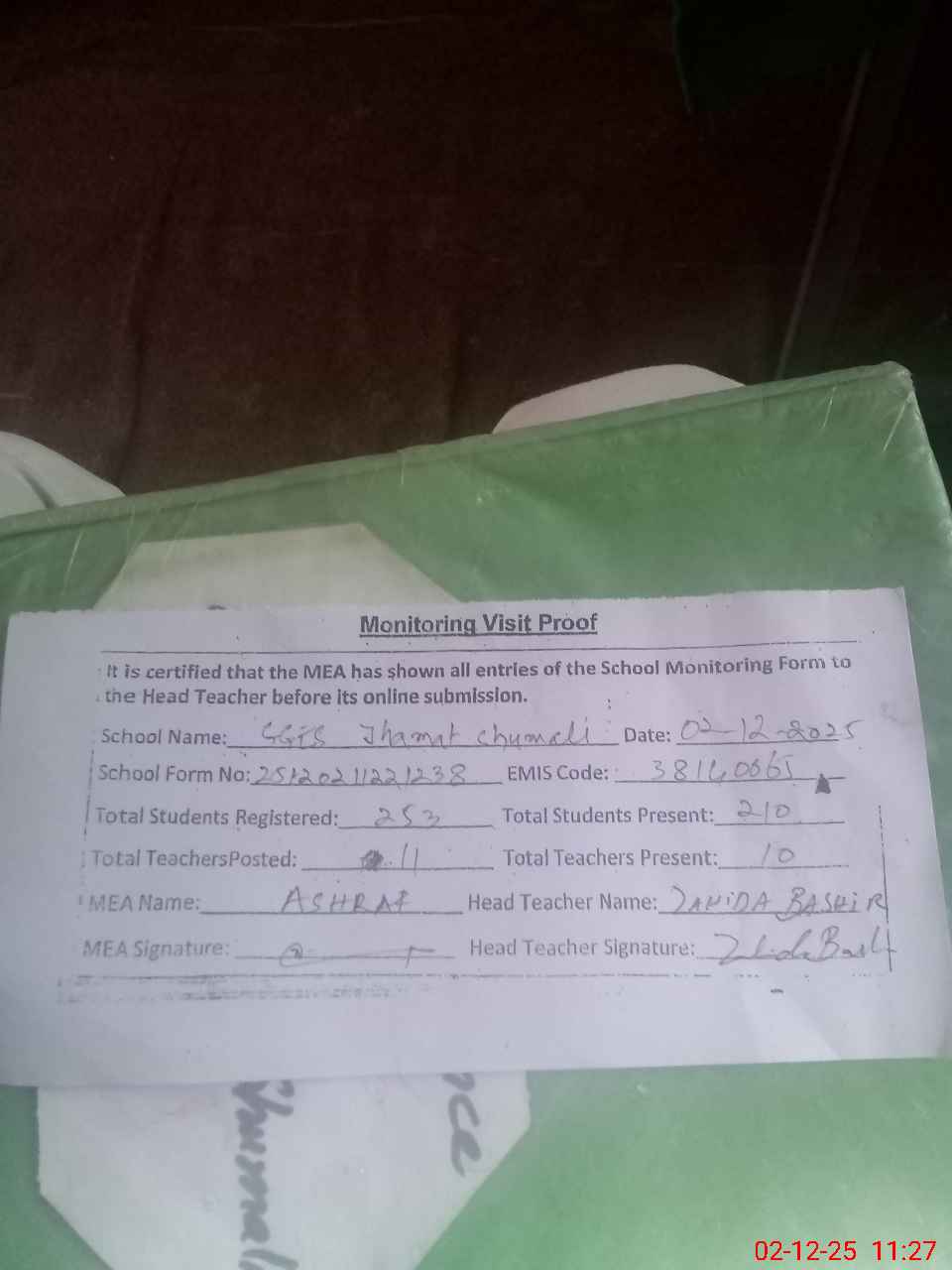 | Attendance Register | Head Teacher | MEA with School | Visit Proof |