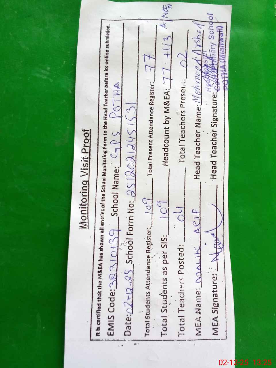 | Attendance Register | Head Teacher | MEA with School | Visit Proof |
