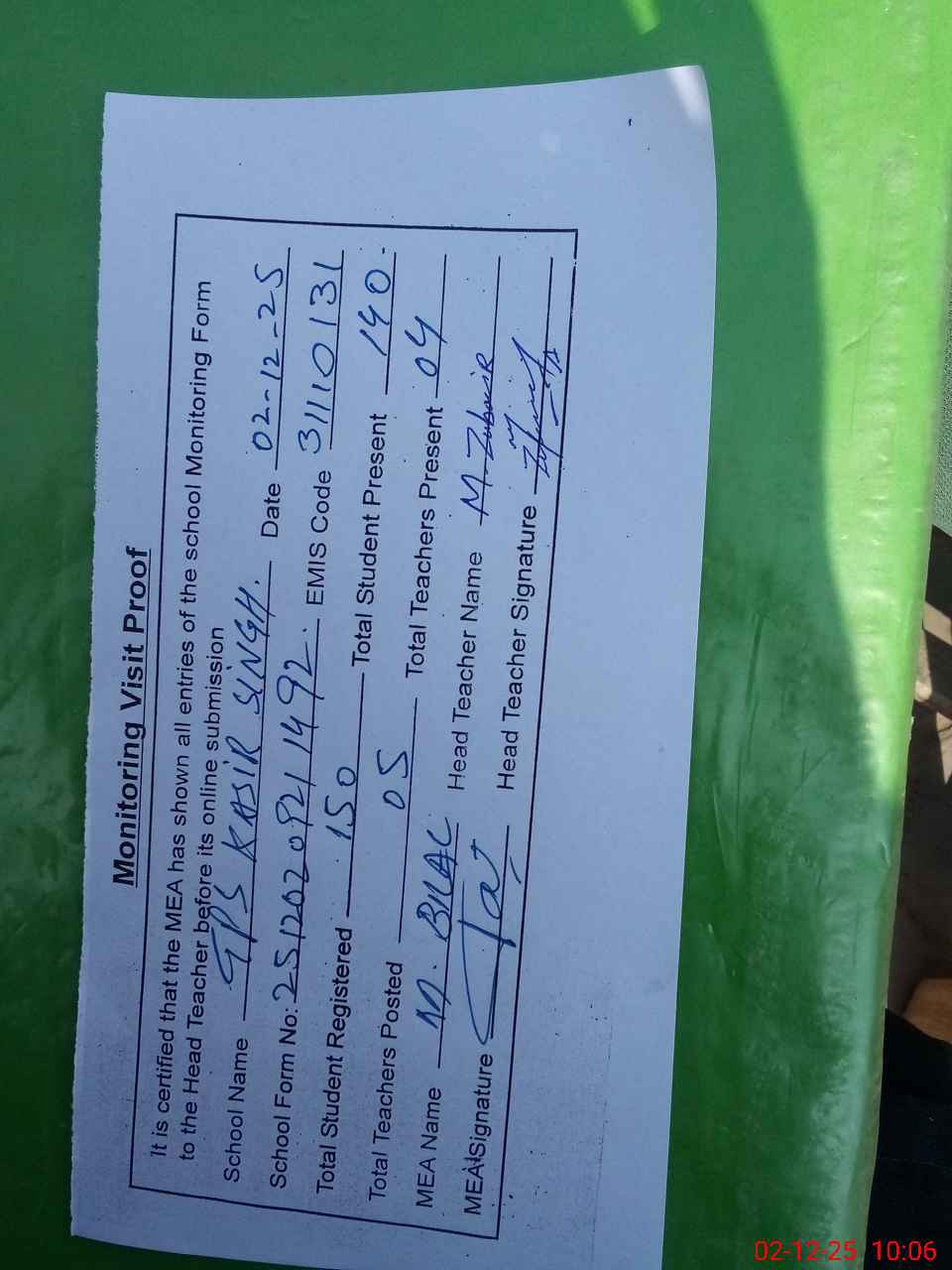 | Attendance Register | Head Teacher | MEA with School | Visit Proof |