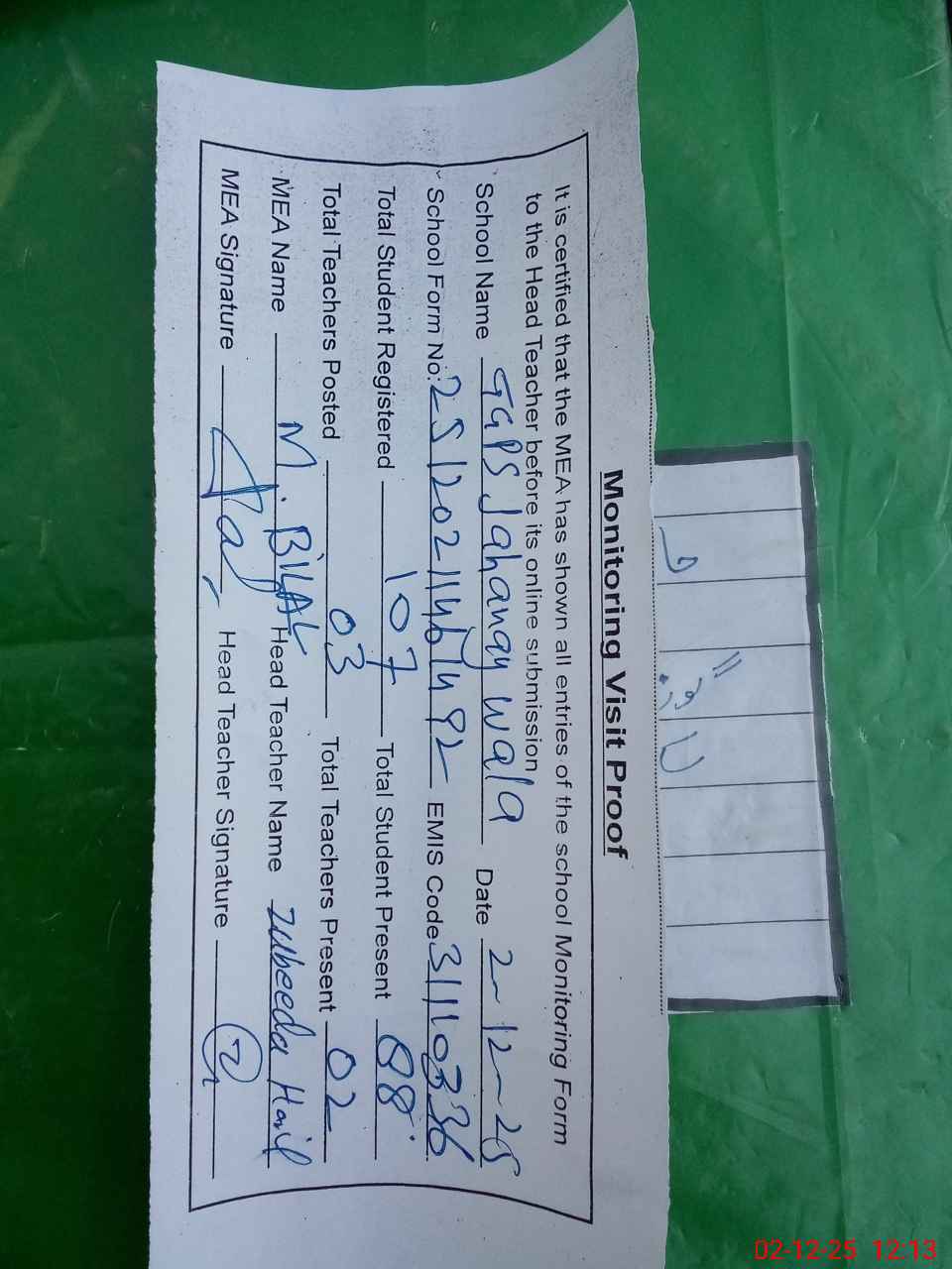 | Attendance Register | Head Teacher | MEA with School | Visit Proof |