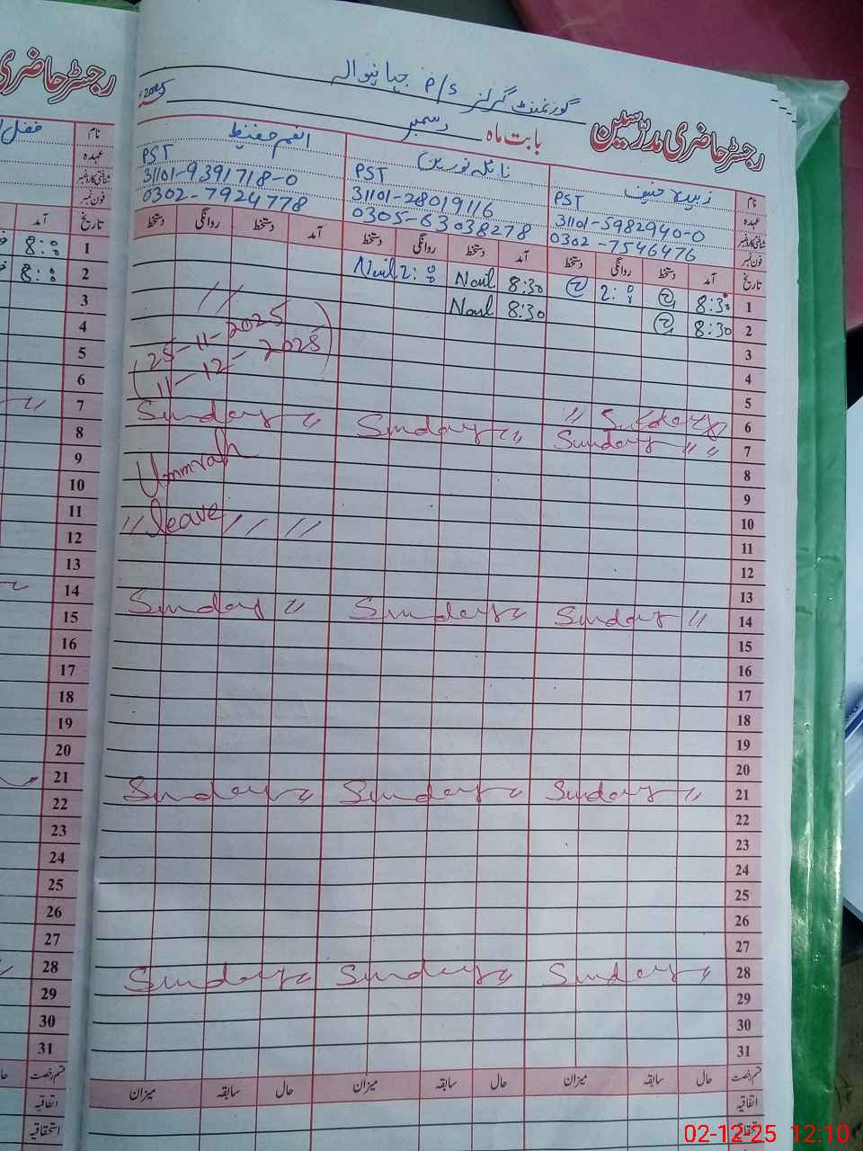 | CNIC | Full Name | Designation | R/C | Absence During Last Calender Month |