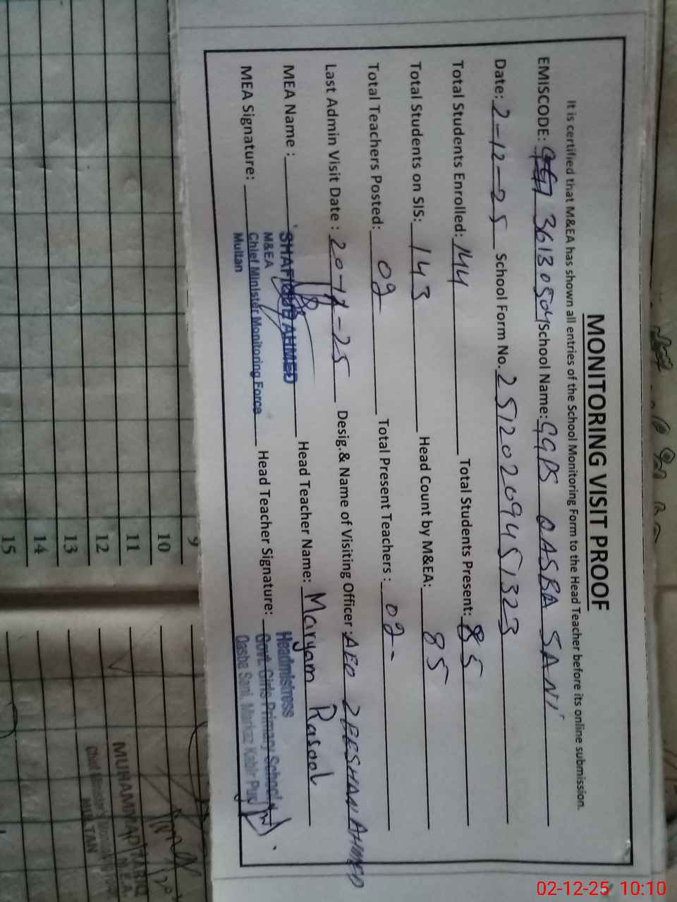 | Attendance Register | Head Teacher | MEA with School | Visit Proof |
