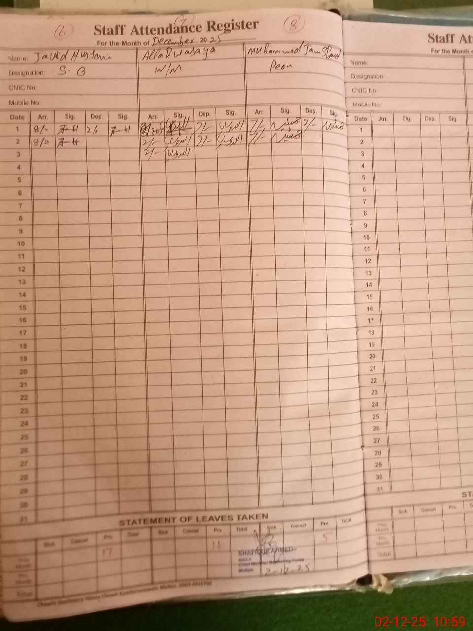 | CNIC | Full Name | Designation | R/C | Absence during last cal. month |