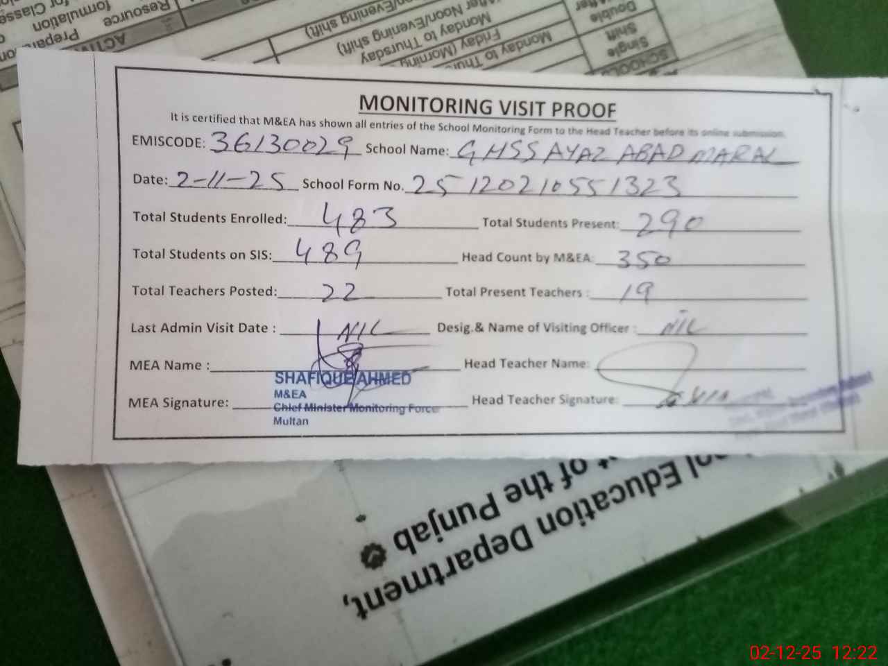 | EMIS Code: 36130029 | Name of School: GHSS AYAZ ABAD MARAL MULTAN | |||