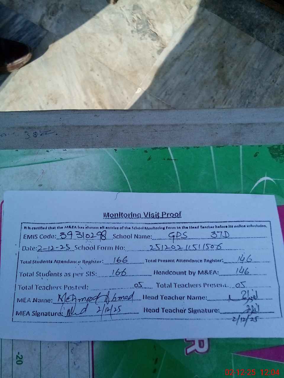 | Attendance Register | Head Teacher | MEA with School | Visit Proof |