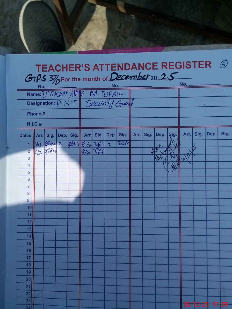 | Name: NA**** AH**** Designation: (School Headmaster's/Headmistress's) PST Phone/Cell Number: 03**** |