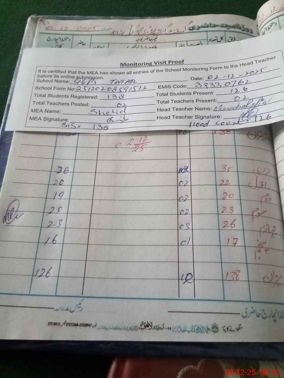 | Attendance Register | Head Teacher | MEA with School | Visit Proof |