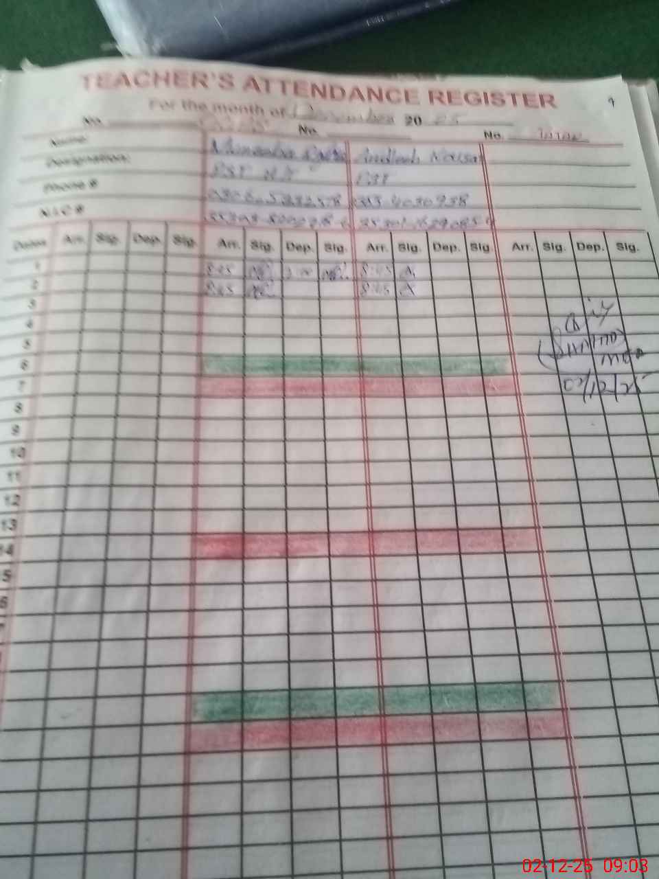 | CNIC | Full Name | Designation | R/C | Absence During Last Calender Month |