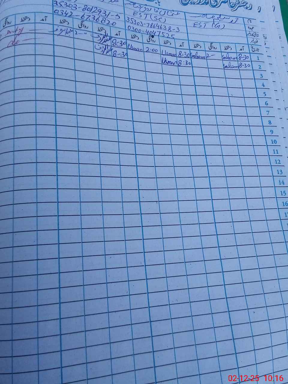 | CNIC | Full Name | Designation | R/C | Absence During Last Calender Month |