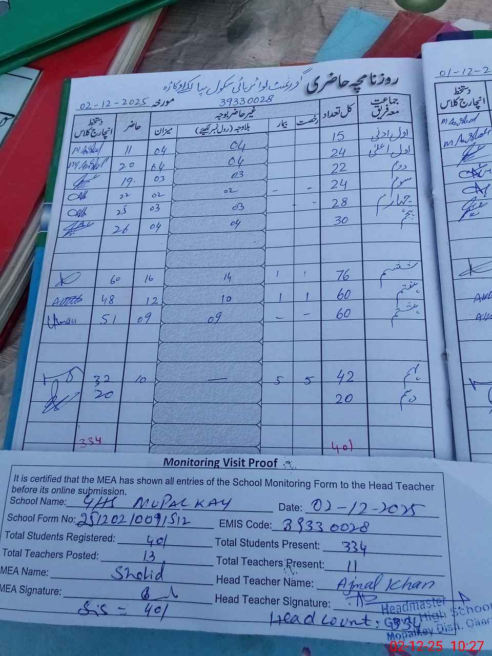 | Attendance Register | Head Teacher | MEA with School | Visit Proof |