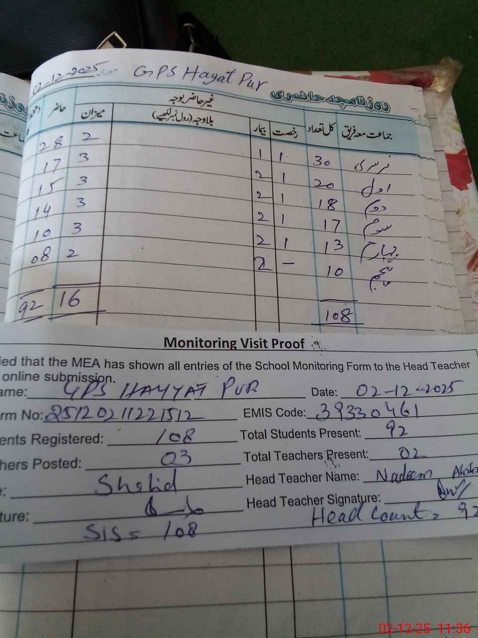 | EMIS Code: 39330461 | Name of School: GPS HAYAT PUR | |||