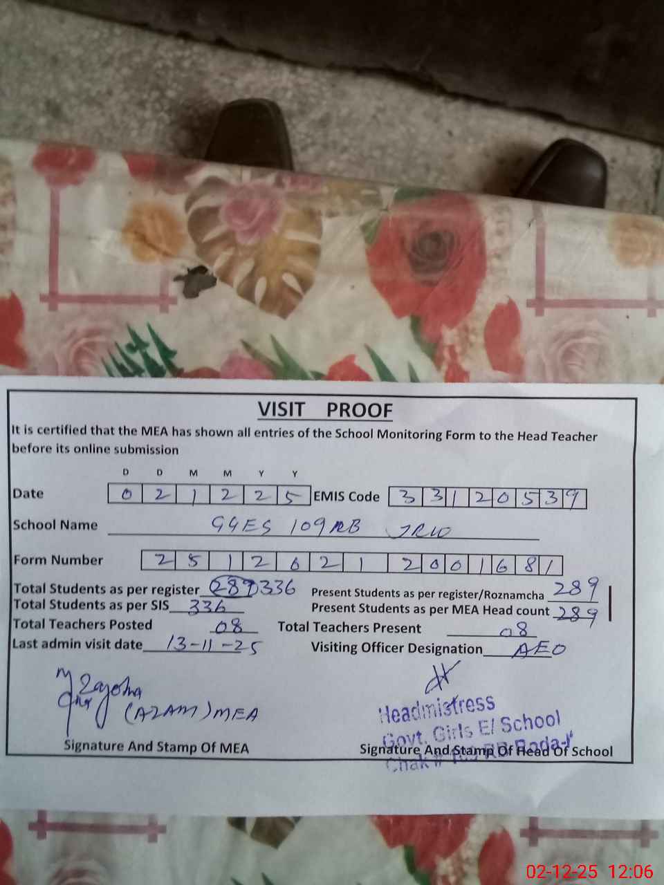 | Attendance Register | Head Teacher | MEA with School | Visit Proof |