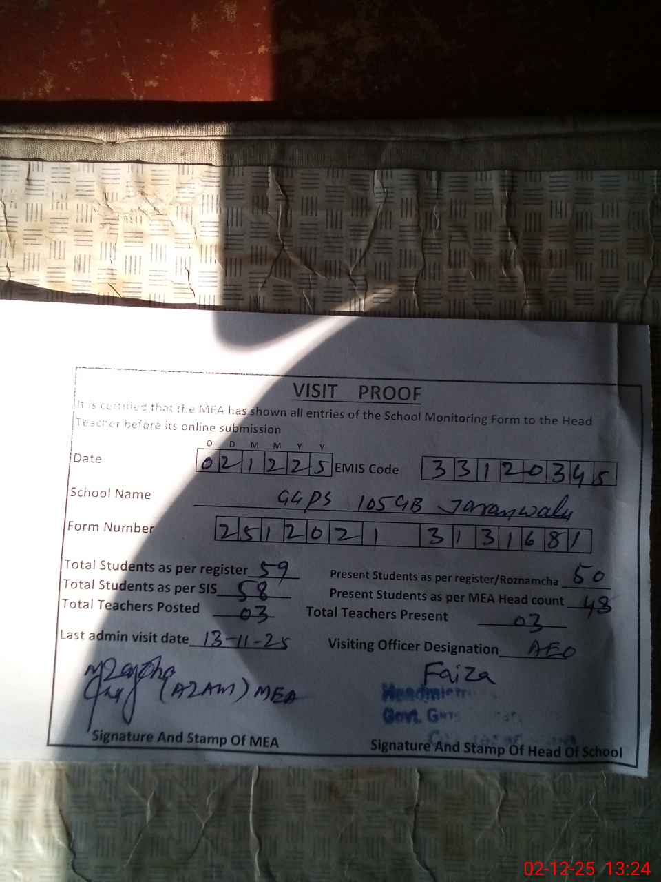 | EMIS Code: 33120345 | Name of School: GGPS CHAK 105 GB JARANWALA | |||