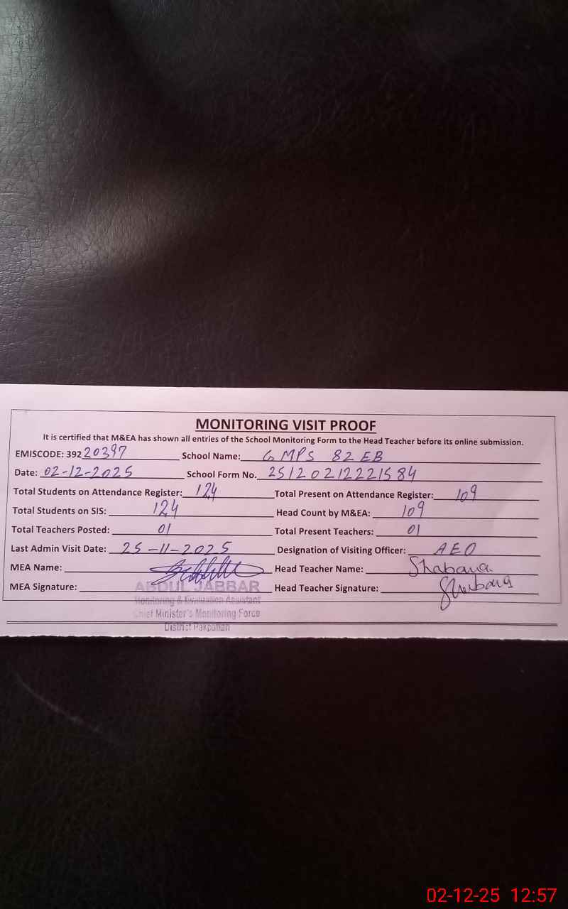 | EMIS Code: 39220397 | Name of School: GMPS 82/EB PO 66/EB ARIFWALA DISTT PAKPATTAN | |||