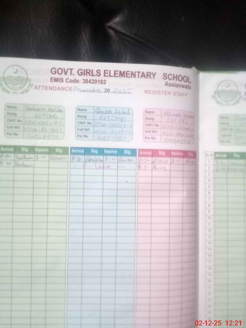 | CNIC | Full Name | Designation | R/C | Absence During Last Calender Month |