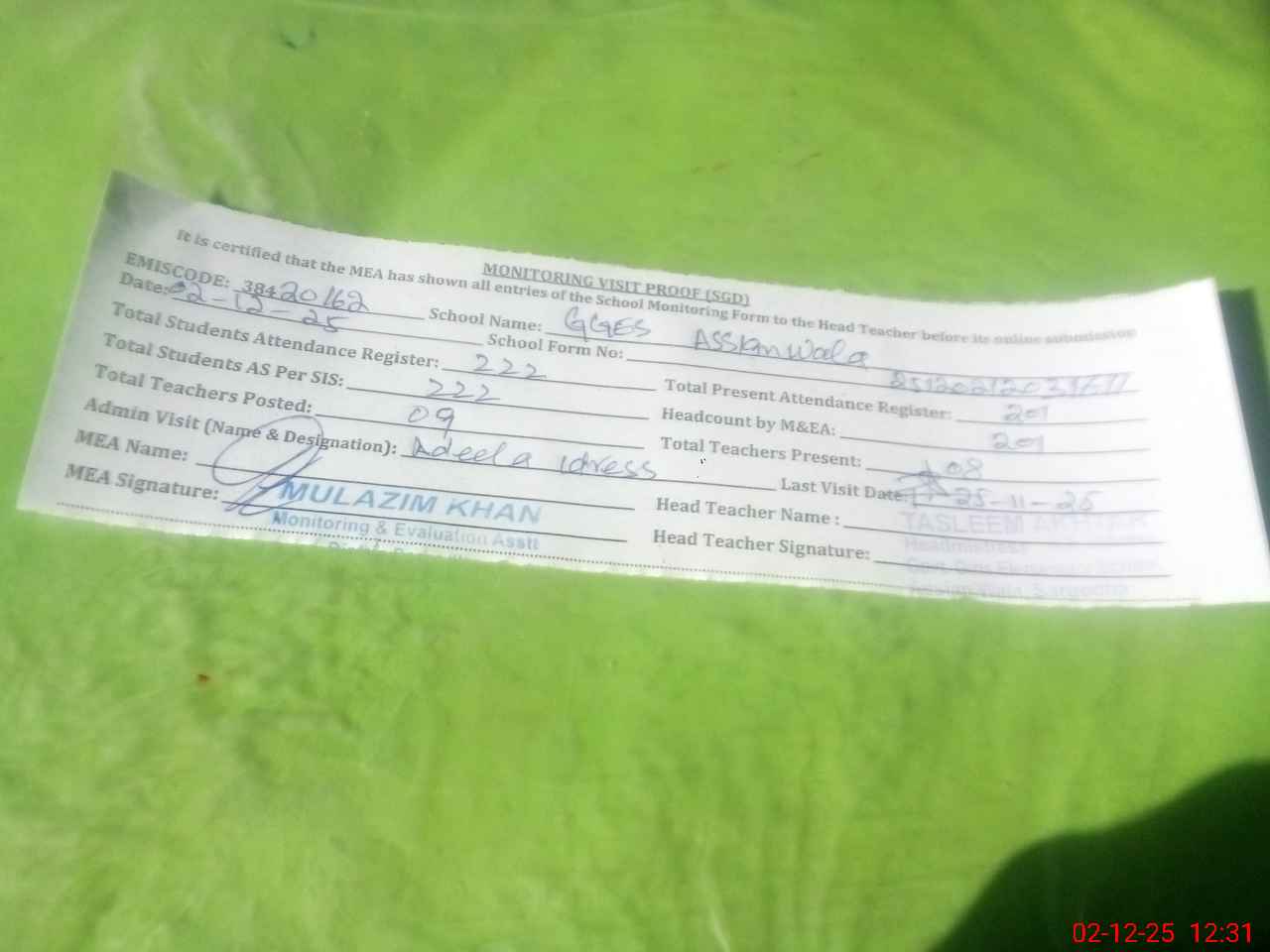 | Attendance Register | Head Teacher | MEA with School | Visit Proof |