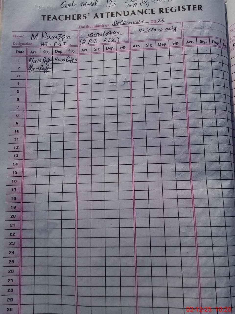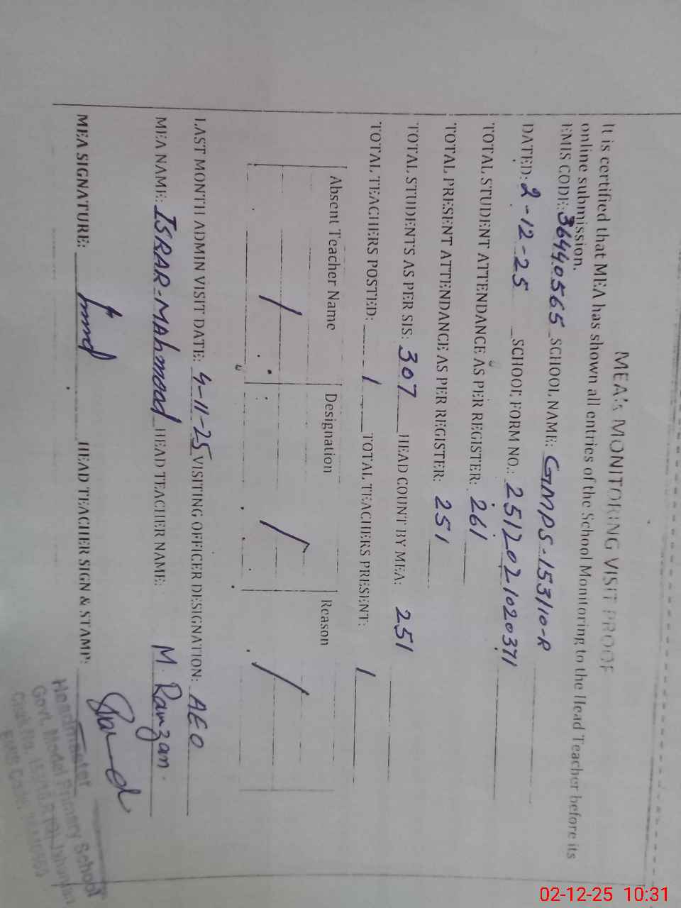 | Attendance Register | Head Teacher | MEA with School | Visit Proof |
