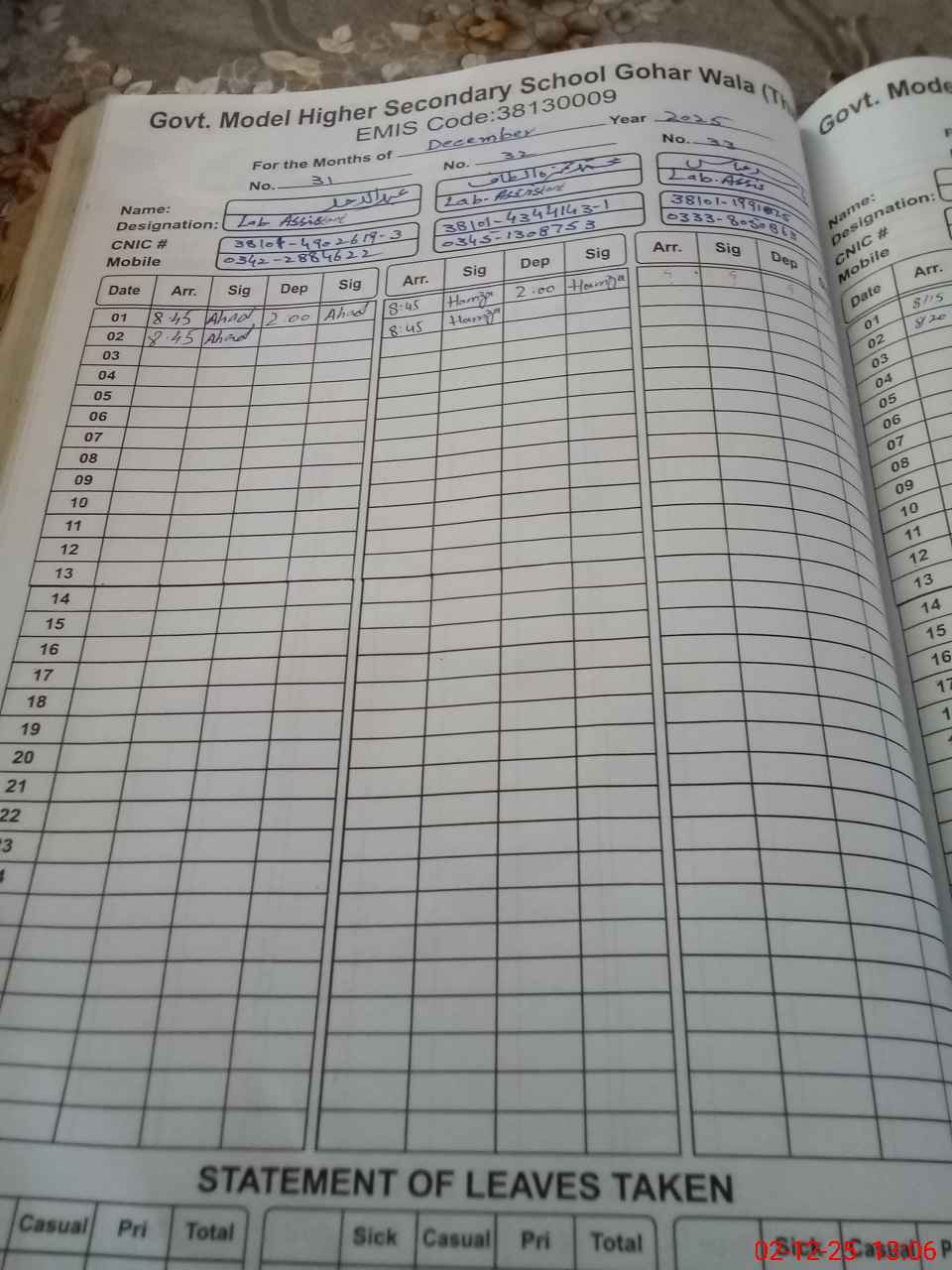 | CNIC | Full Name | Designation | R/C | Absence during last cal. month |
