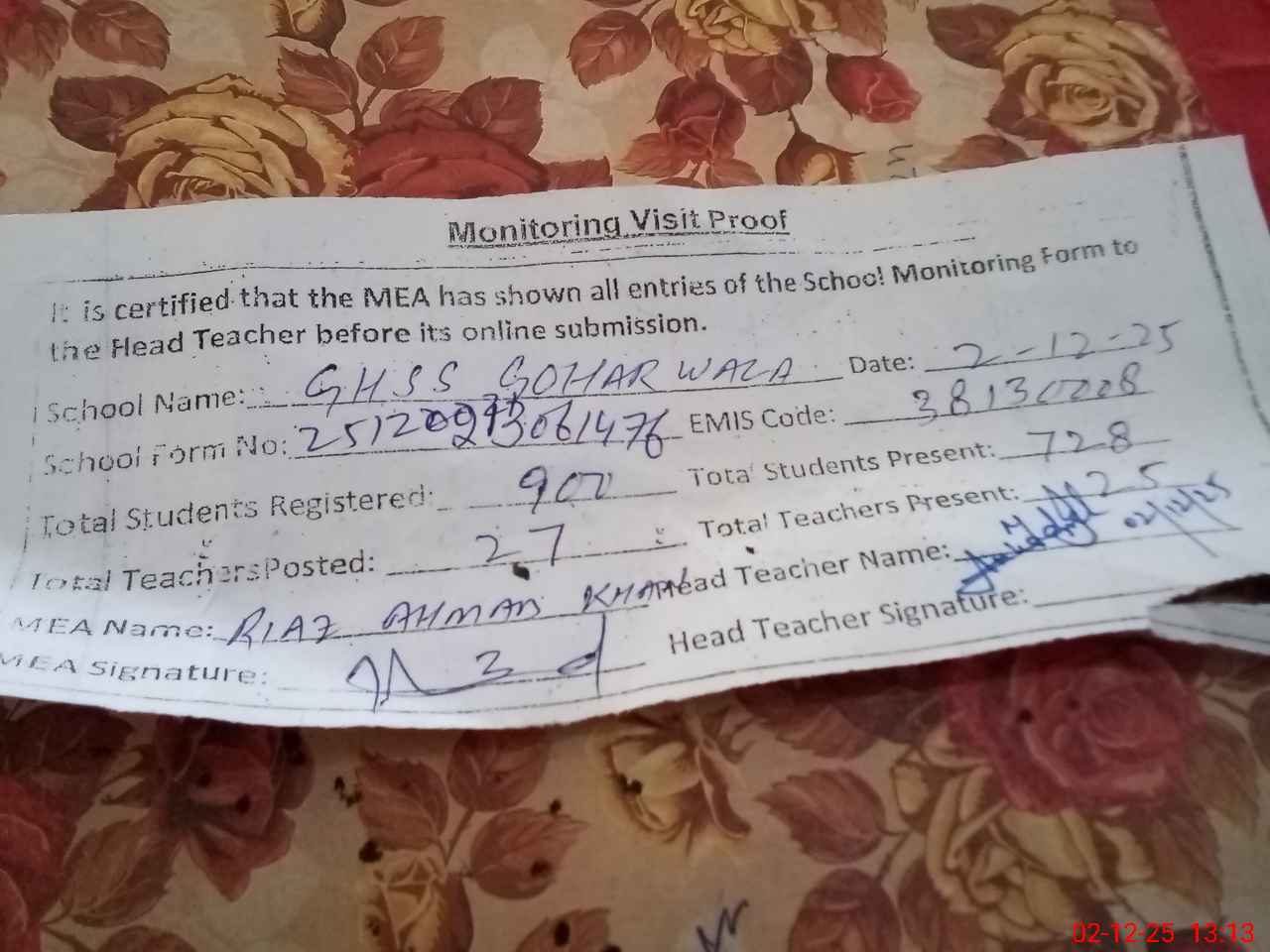 | Attendance Register | Head Teacher | MEA with School | Visit Proof |