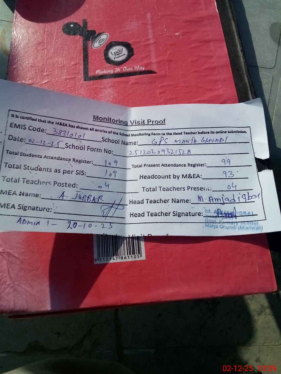 | Attendance Register | Head Teacher | MEA with School | Visit Proof |