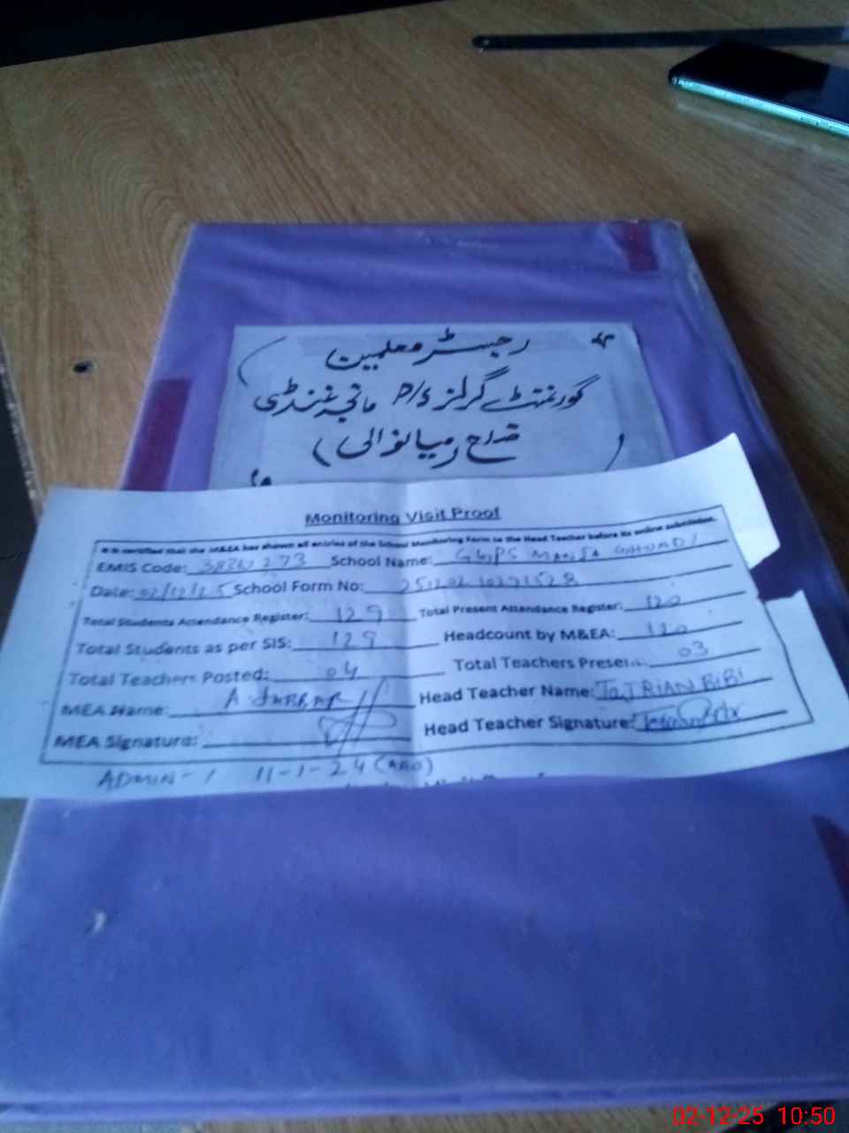 | Attendance Register | Head Teacher | MEA with School | Visit Proof |