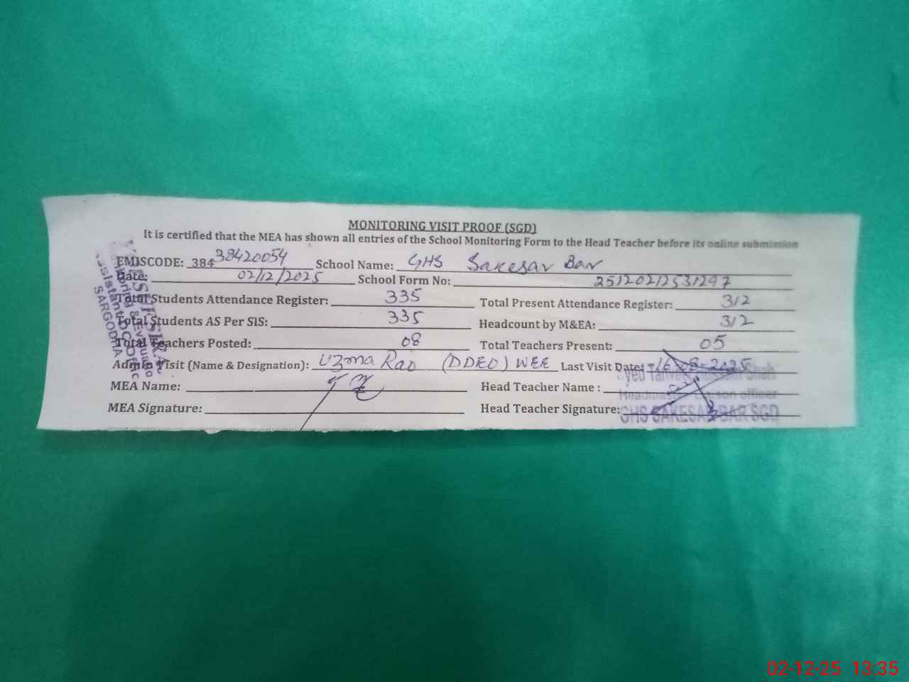 | Attendance Register | Head Teacher | MEA with School | Visit Proof |