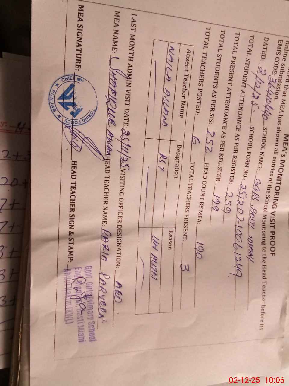 | Attendance Register | Head Teacher | MEA with School | Visit Proof |