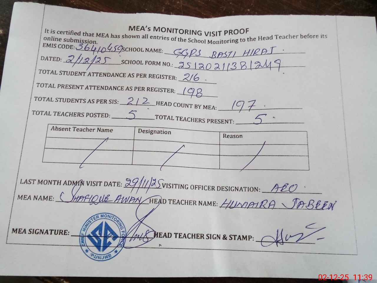 | Attendance Register | Head Teacher | MEA with School | Visit Proof |