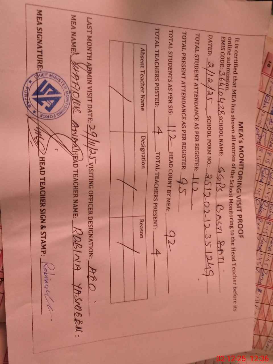 | Attendance Register | Head Teacher | MEA with School | Visit Proof |