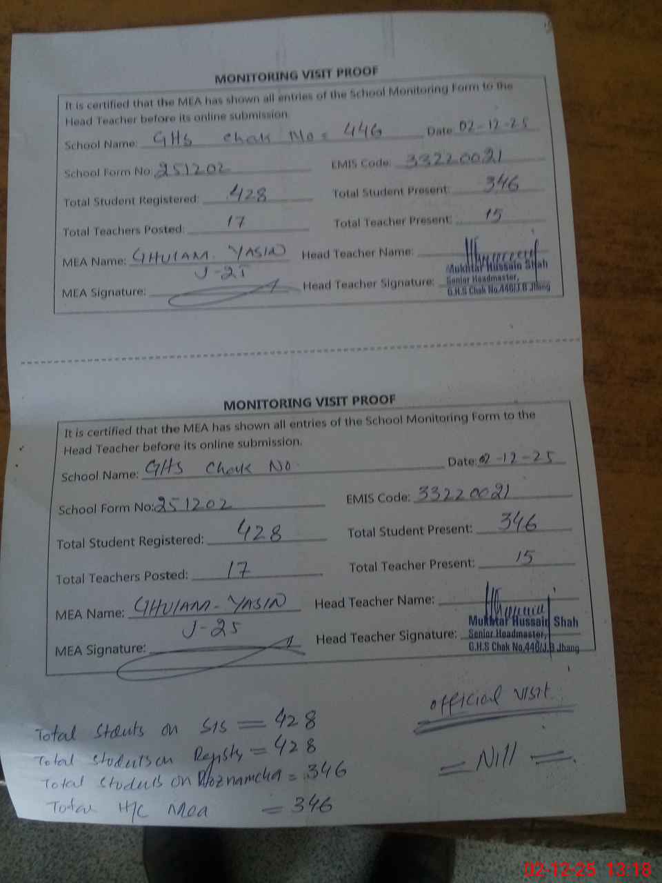 | EMIS Code: 33220021 | Name of School: GHS CHAK NO 446 JB | |||