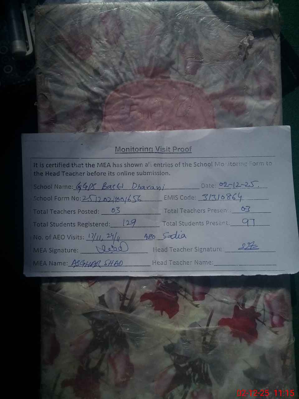 | Attendance Register | Head Teacher | MEA with School | Visit Proof |